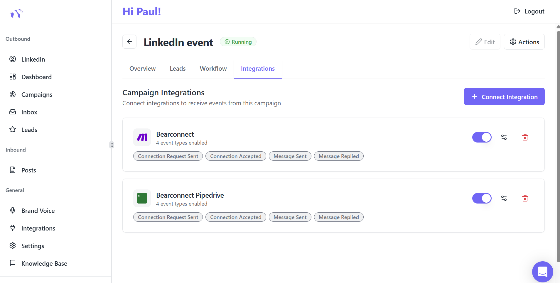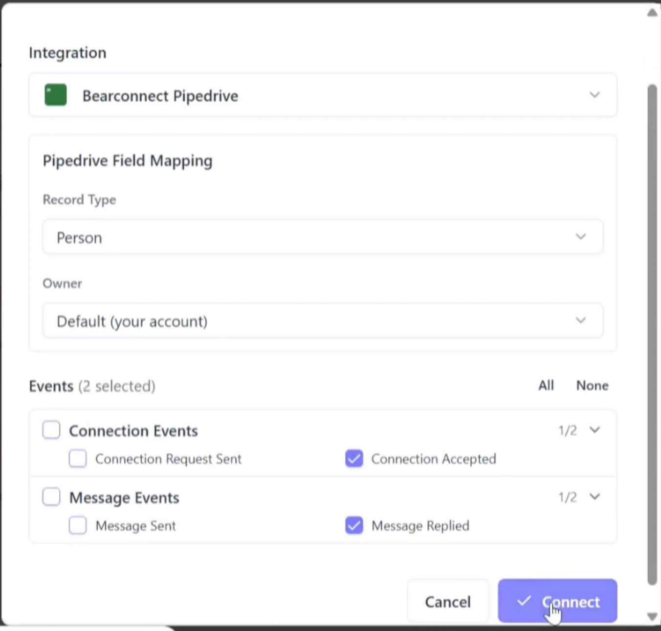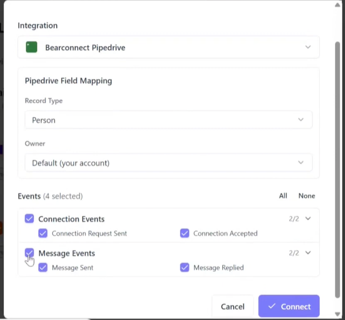 Yes. When you map Pipedrive to a campaign, you choose exactly which events to enable: Connection Request Sent, Connection Accepted, Message Sent, and Message Replied. You can also turn the entire mapping on or off using a toggle without deleting the configuration.