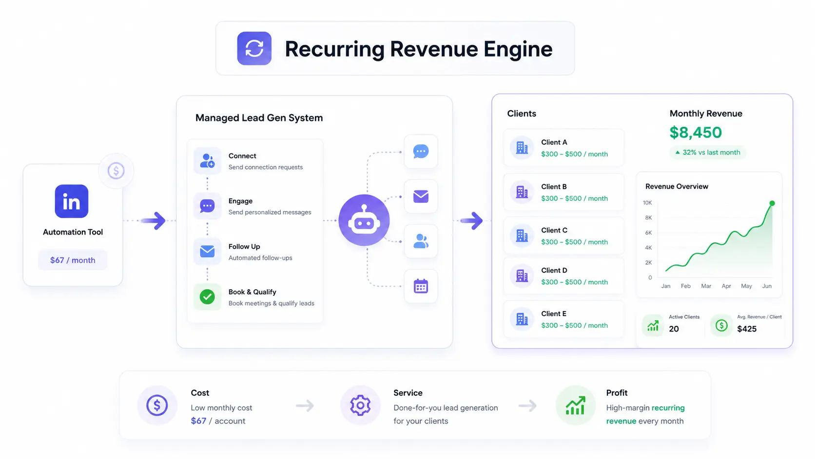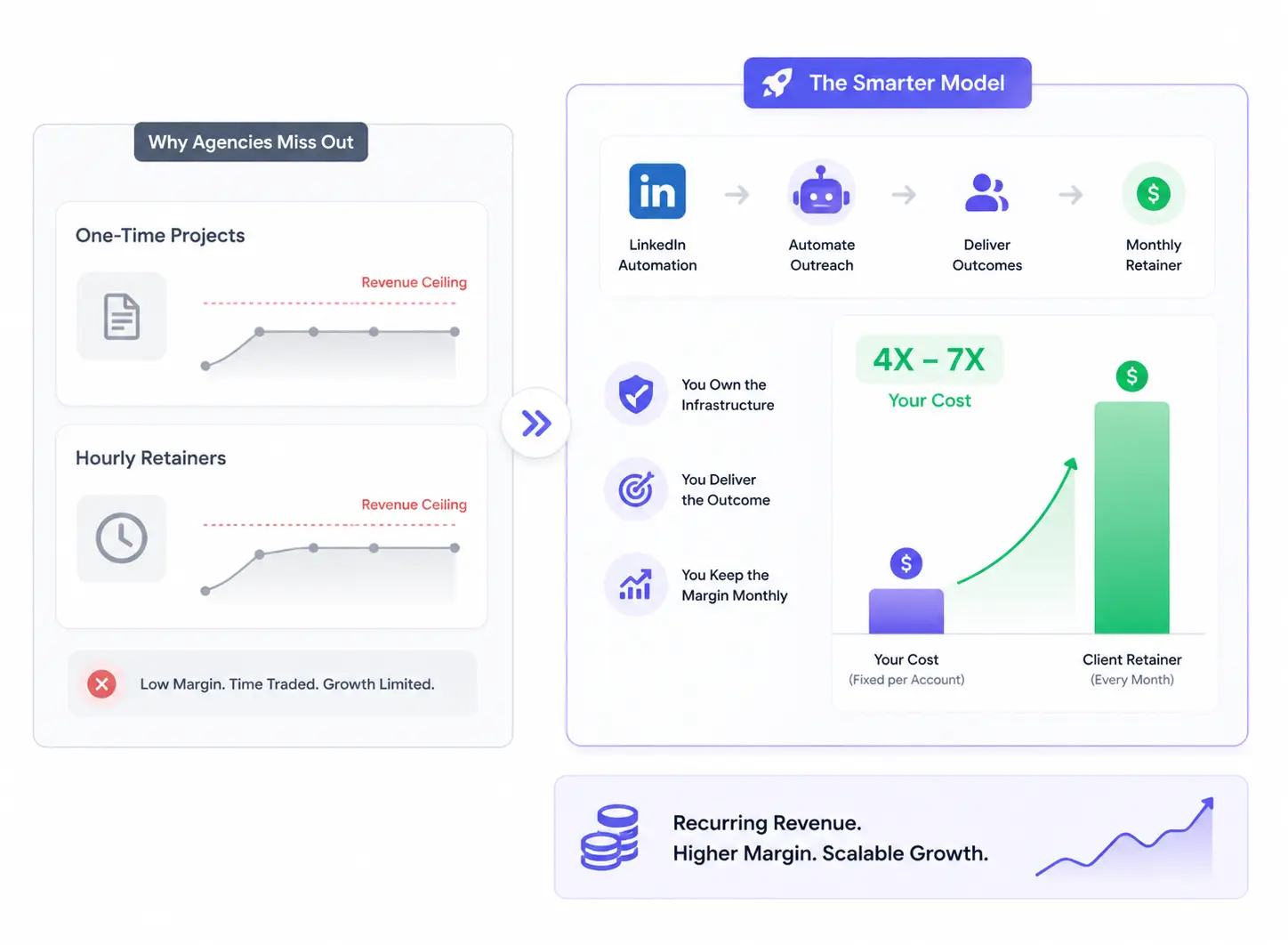 LinkedIn automation makes this possible. You pay a fixed cost per account, automate the work, and collect a monthly retainer that is 4 to 7 times your cost.