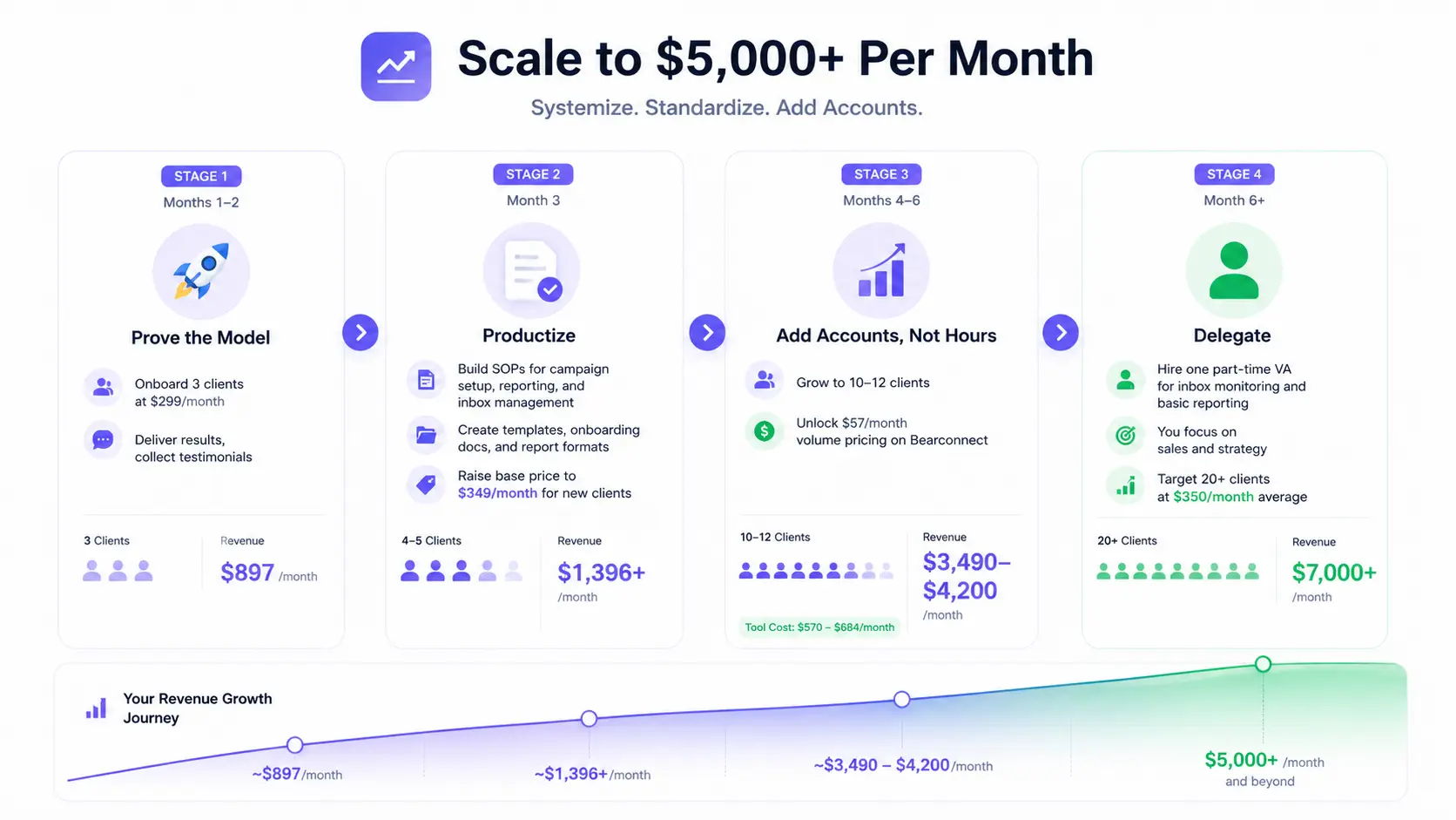 Scaling this model comes down to systematizing onboarding, standardizing delivery, and adding accounts, not team members. Use the Bearconnect 90-day LinkedIn automation scaling plan as your operational reference.