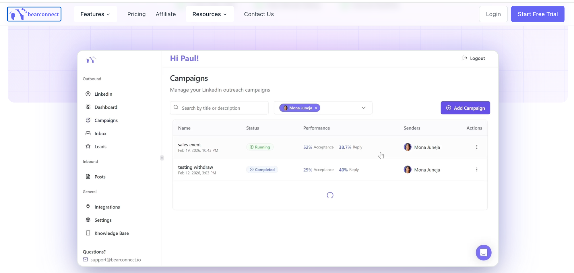 Bearconnect removes that ceiling: one subscription supports unlimited LinkedIn account connections, unlimited campaigns, and a unified inbox for all accounts.