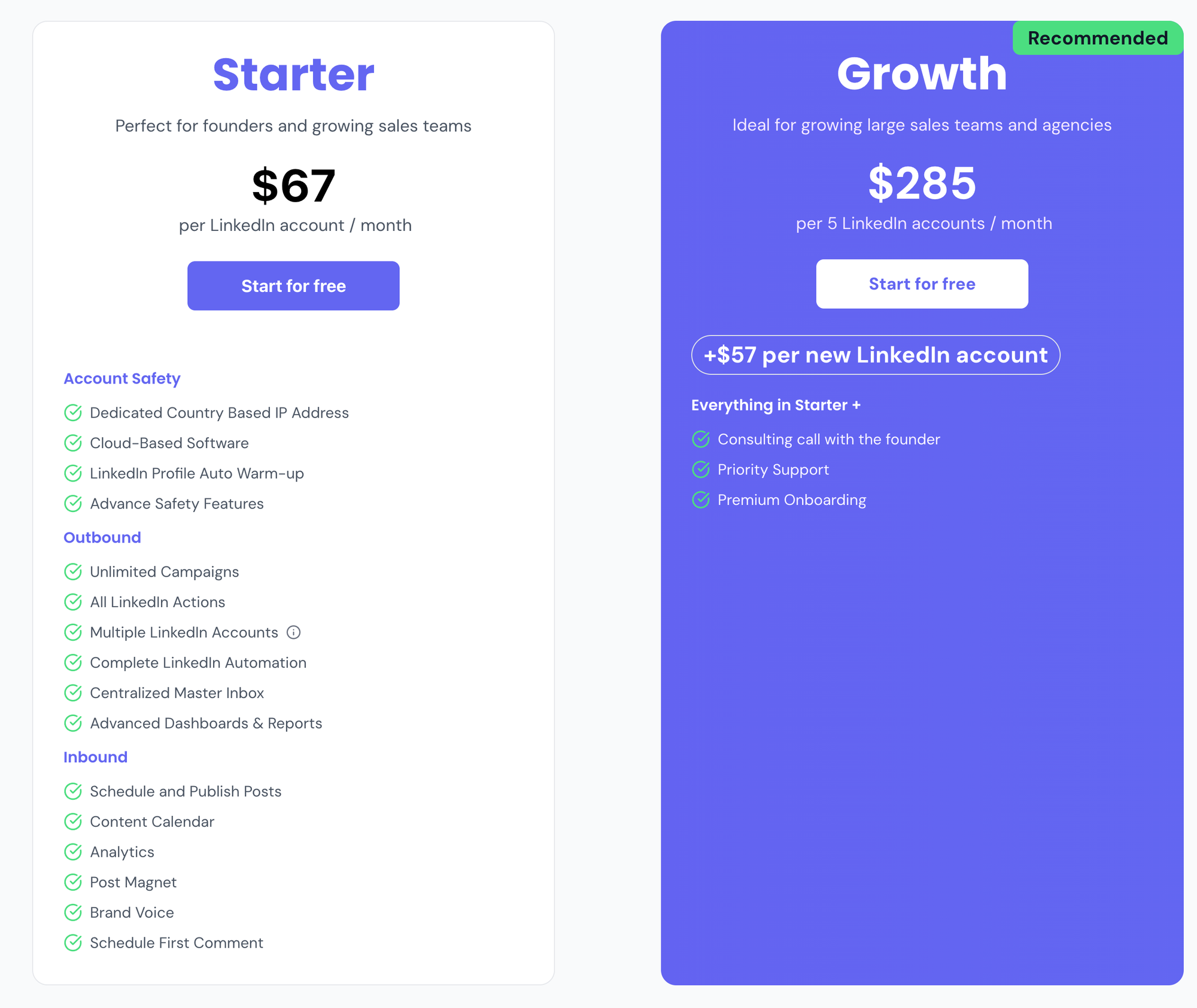 Pricing stays at $67/month per LinkedIn account, dropping to $57/month when you connect 5 or more accounts.