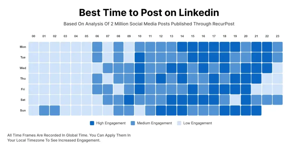 Worst times: Weekends and late nights (8 PM+) typically show 60% lower engagement for professional B2B content.