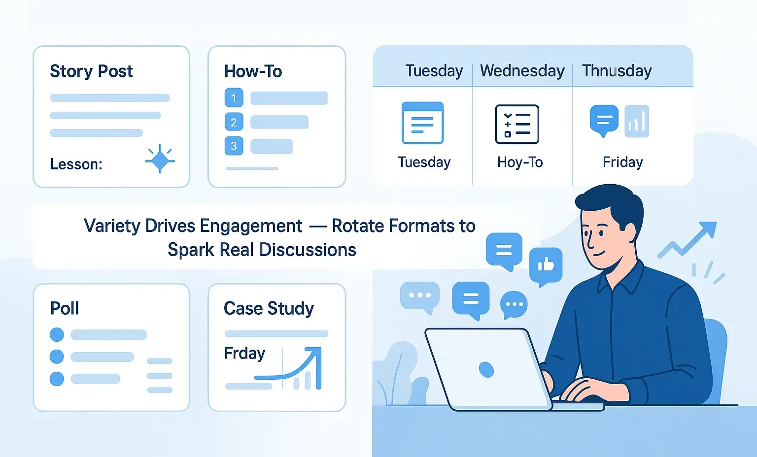 Scheduling should not mean publishing lifeless “announcements.” You keep engagement high by choosing formats that invite reactions and replies.