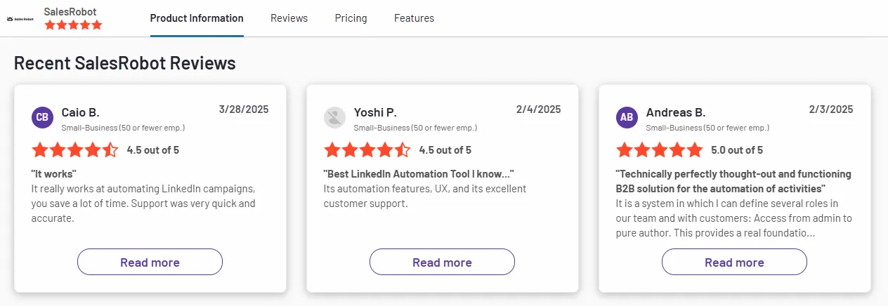 Salesrobot maintains solid G2 ratings with users highlighting significant time savings and straightforward setup processes.