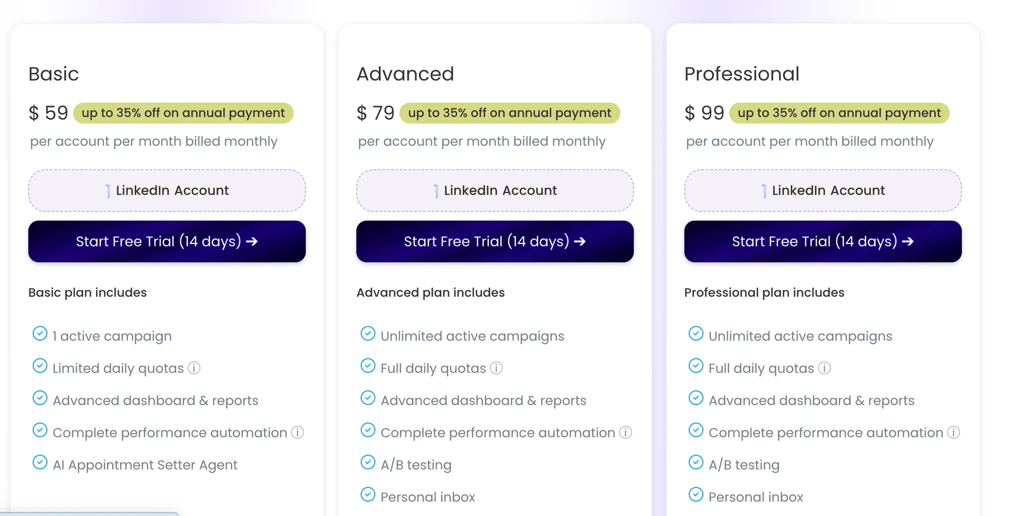 - Per-account pricing: At $59 per account monthly, costs escalate quickly for teams managing multiple LinkedIn profiles.