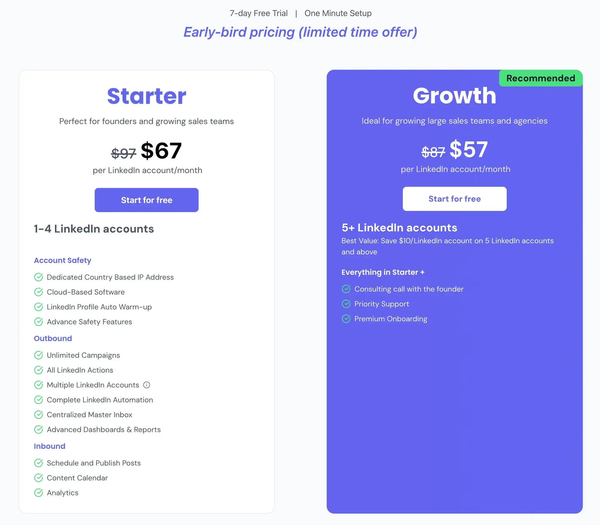 - The $67 monthly / Per LinkedIn acoount with Unlimited campiagns versus Salesrobot's $59+ per-account model but with only one active Campaign setup.