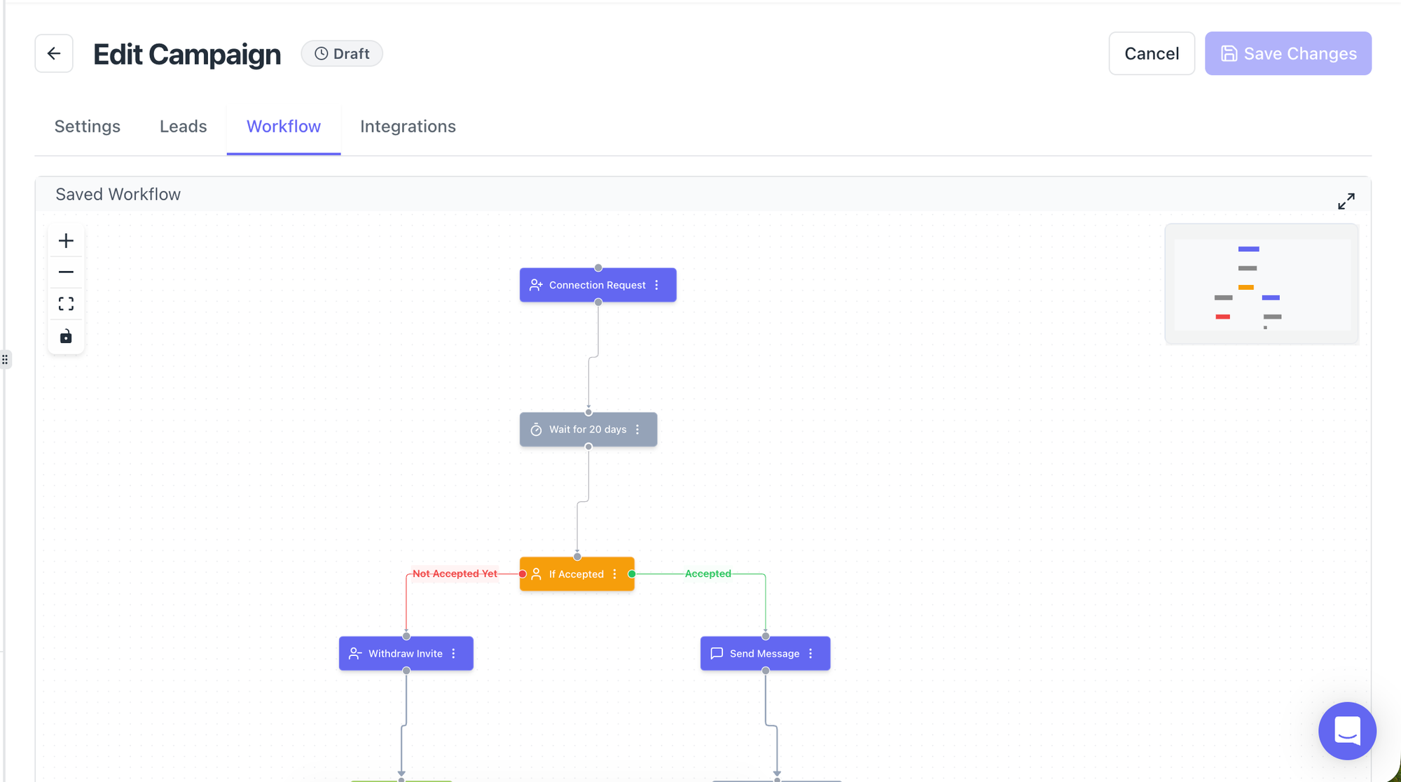 You'll see your existing workflow steps (connection request, follow-up messages, delays, etc.).